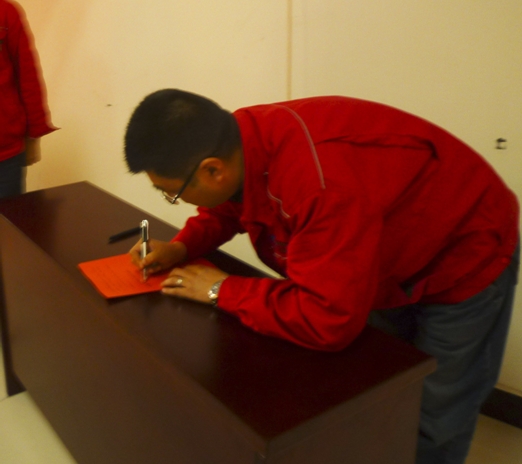 動員大會上各級領(lǐng)導、各車間管理干部、車間班組長上臺進行“百日安全大練兵”活動簽字儀式。